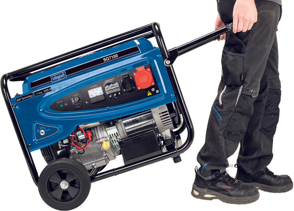 De Scheppach SG7100 generator wordt aangedreven door een 420cc viertaktmotor met een maximaal vermogen van 5500 W. Dit maakt hem een krachtig gereedschap voor klussen in huis of op de bouwplaats. Het robuuste stalen frame, de transportwielen en de uitklapbare handgrepen maken de generator mobiel en veelzijdig. De benzinetank van 25 liter is goed voor ongeveer 10 uur gebruik en kan worden aangesloten op een 400V-netvoeding om diverse machines van stroom te voorzien. De generator is uitgerust met één 230V / 400V / 12V-aansluiting.